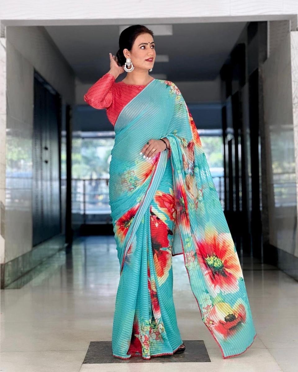 • This saree will present you more glamorous and beautiful to your peers than ever. These sarees are most preferred for the festive because of the lightweight, they can be worn in all four seasons.
