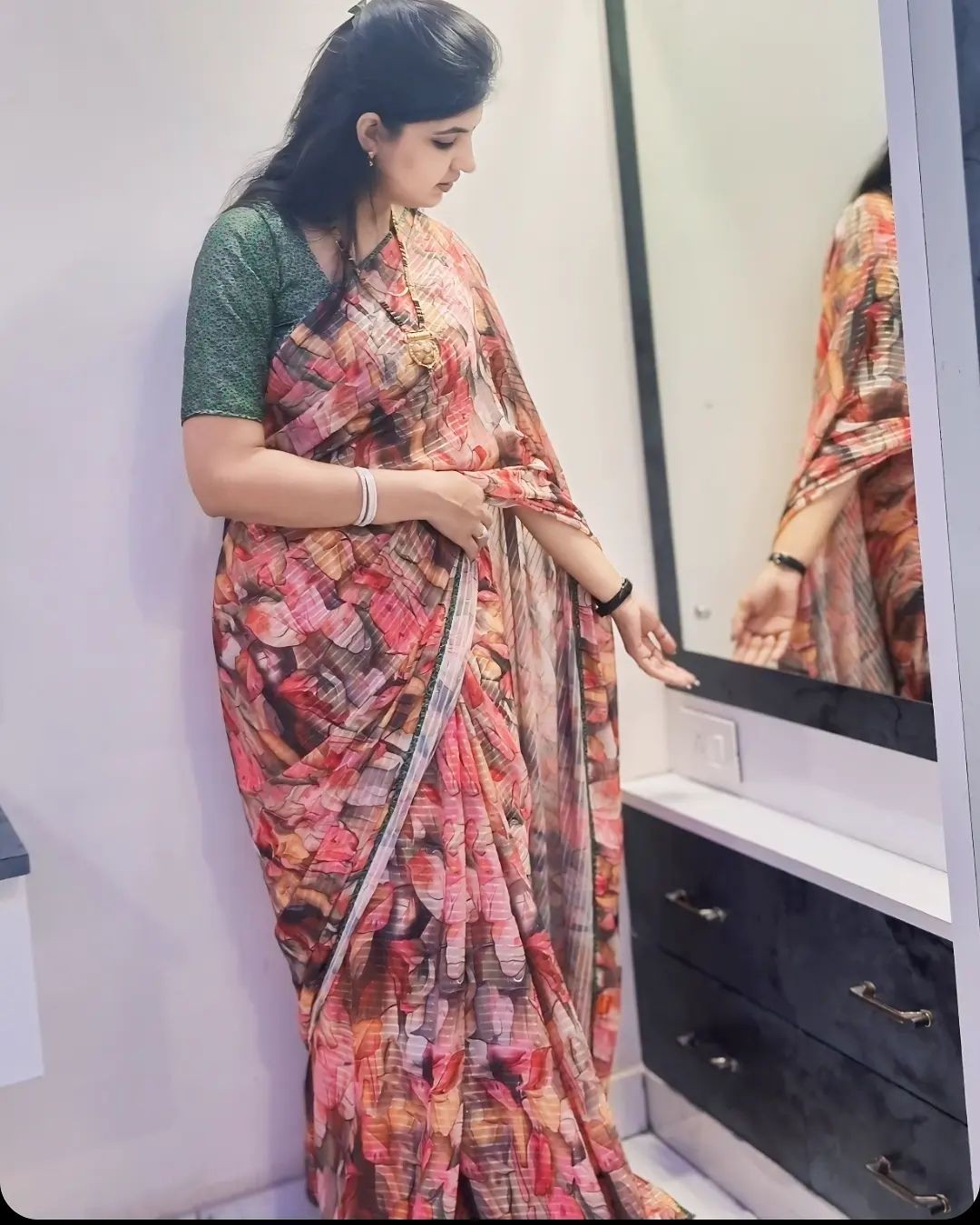 • This saree will present you more glamorous and beautiful to your peers than ever. These sarees are most preferred for the festive because of the lightweight, they can be worn in all four seasons.